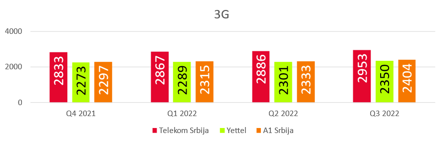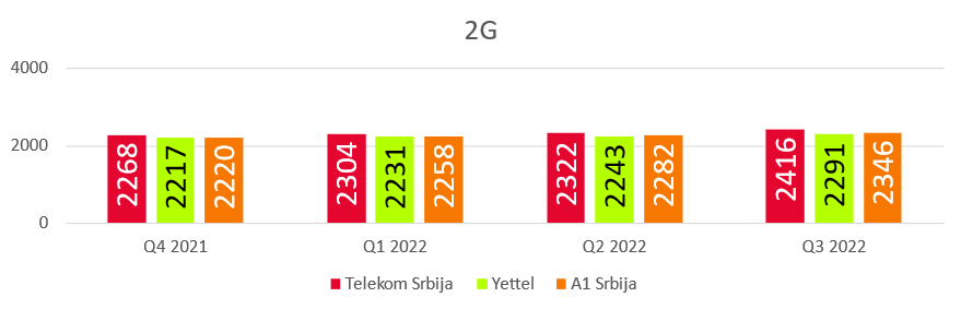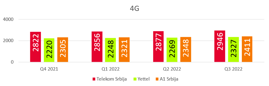 Fig. 5. Total number of locations of base stations per technology and mobile operator until Q3 2022 (Source: RATEL data for Q4 2021, Q1 2022, Q2 2022, Q3 2022, RATEL)