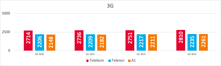 Укупан број активних базних станица које поседују мобилни оператори за различите технологије, закључно са трећим кварталом (Q3) 2021. године, приказан је на Слици 5 (Извор: Преглед квантитета бежичне приступне мреже оператора мобилне телефоније - Четврти квартал 2020. године, Први квартал 2021. године, Други квартал 2021. године, Трећи квартал 2021. године, РАТЕЛ).