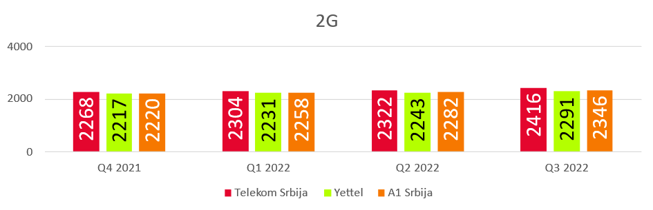 Укупан број активних базних станица које поседују мобилни оператори за различите технологије, закључно са трећим кварталом (Q3) 2022. године, приказан је на Слици 5 (Извор: Преглед квантитета бежичне приступне мреже оператора мобилне телефоније - Четврти квартал 2021. године, Први квартал 2022. године, Други квартал 2022. године, Трећи квартал 2022. године, РАТЕЛ).